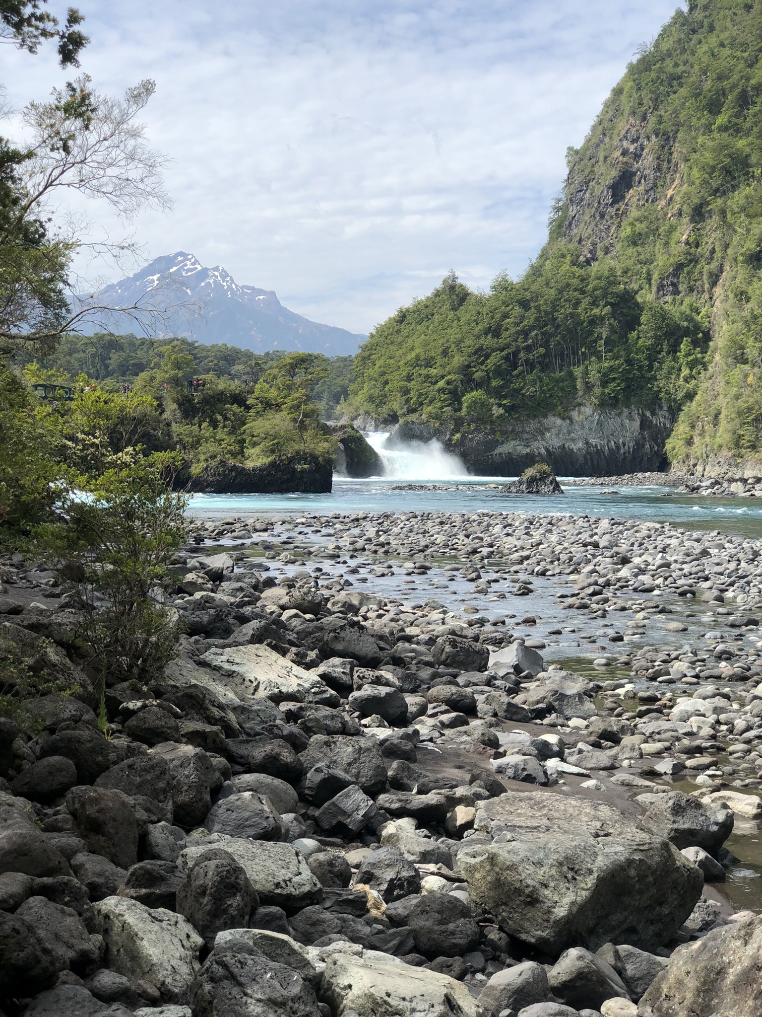 Café da manhã no hotel. Saída para visita aos Saltos de Petrohué (ingresso incluído), com caminhadas leves por mirantes naturais sobre quedas d’água formadas em rochas vulcânicas.